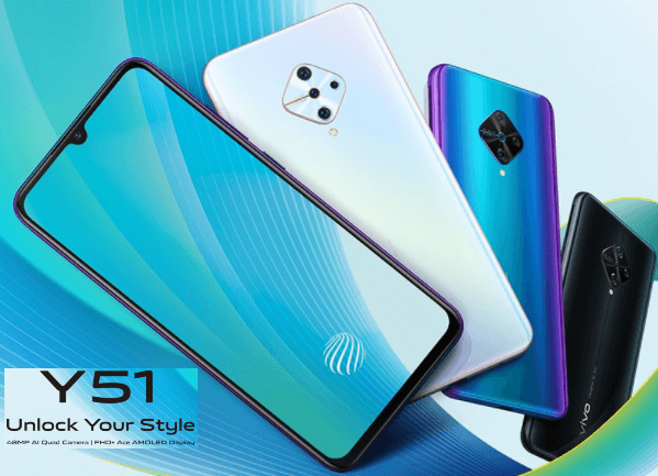 vivo Y51 android smartphone equipped with up to 48MP rear quad camera setup and 16MP front camera. Super AMOLED display, Snapdragon octa-core processor, all day long battery and powered by Android 10.